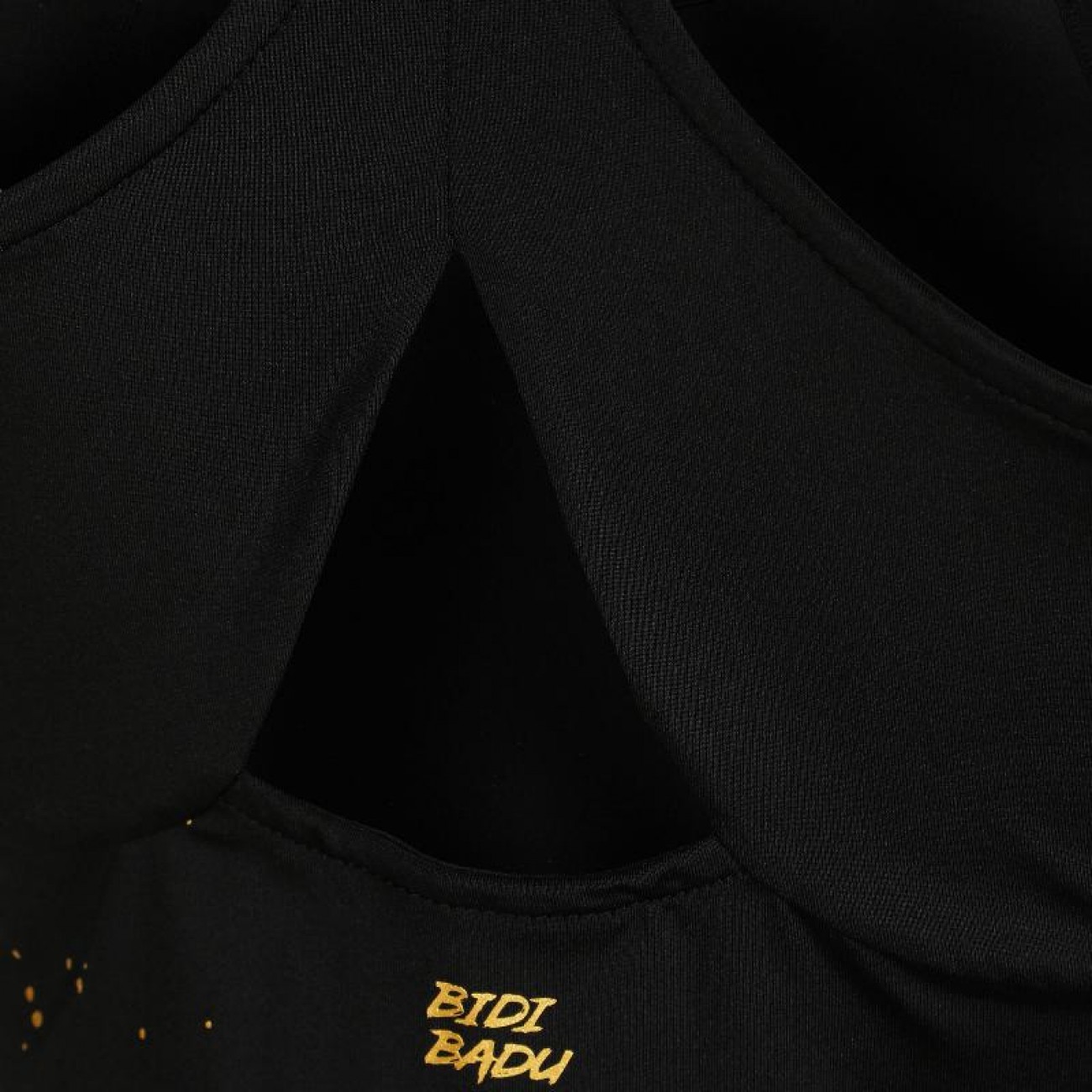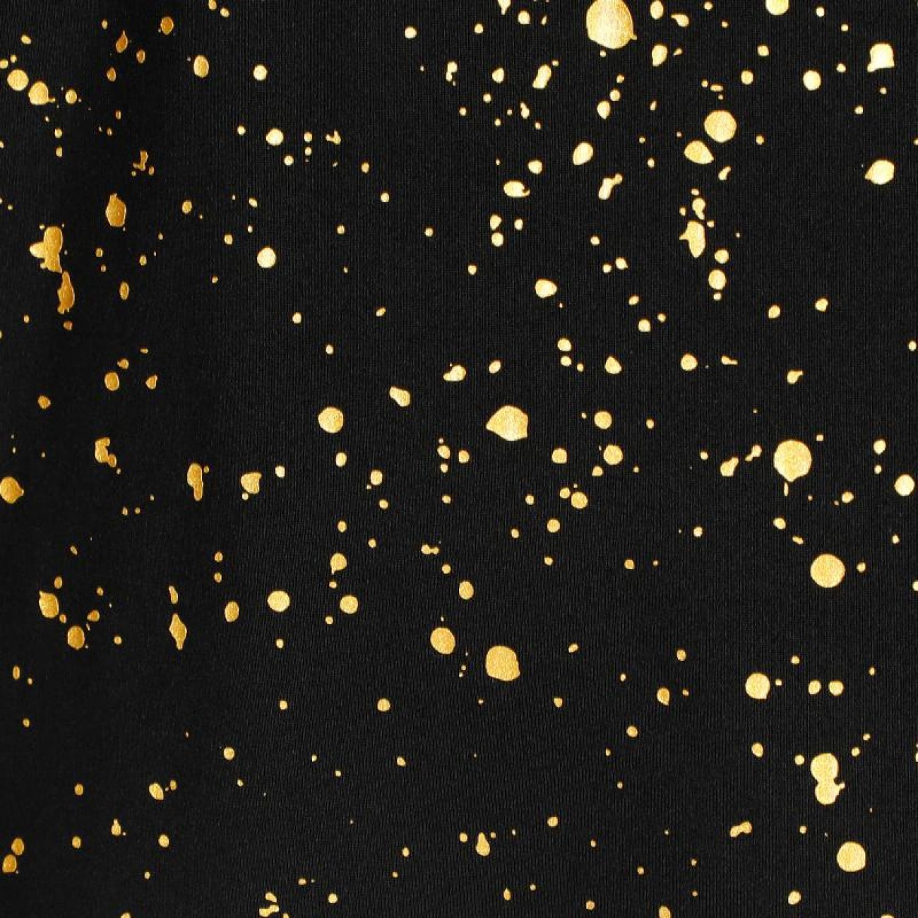 Un negro intenso y profundo forma el telón de fondo de las motas doradas, inspiradas en las cenizas volantes de las canchas de tierra batida de París.
